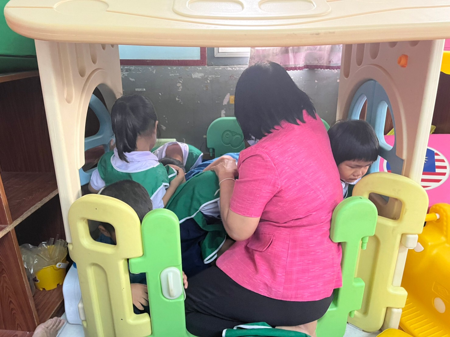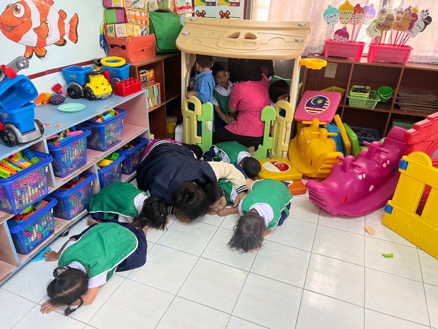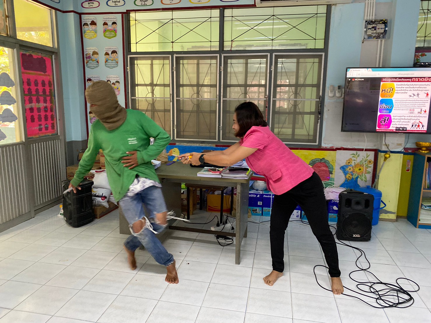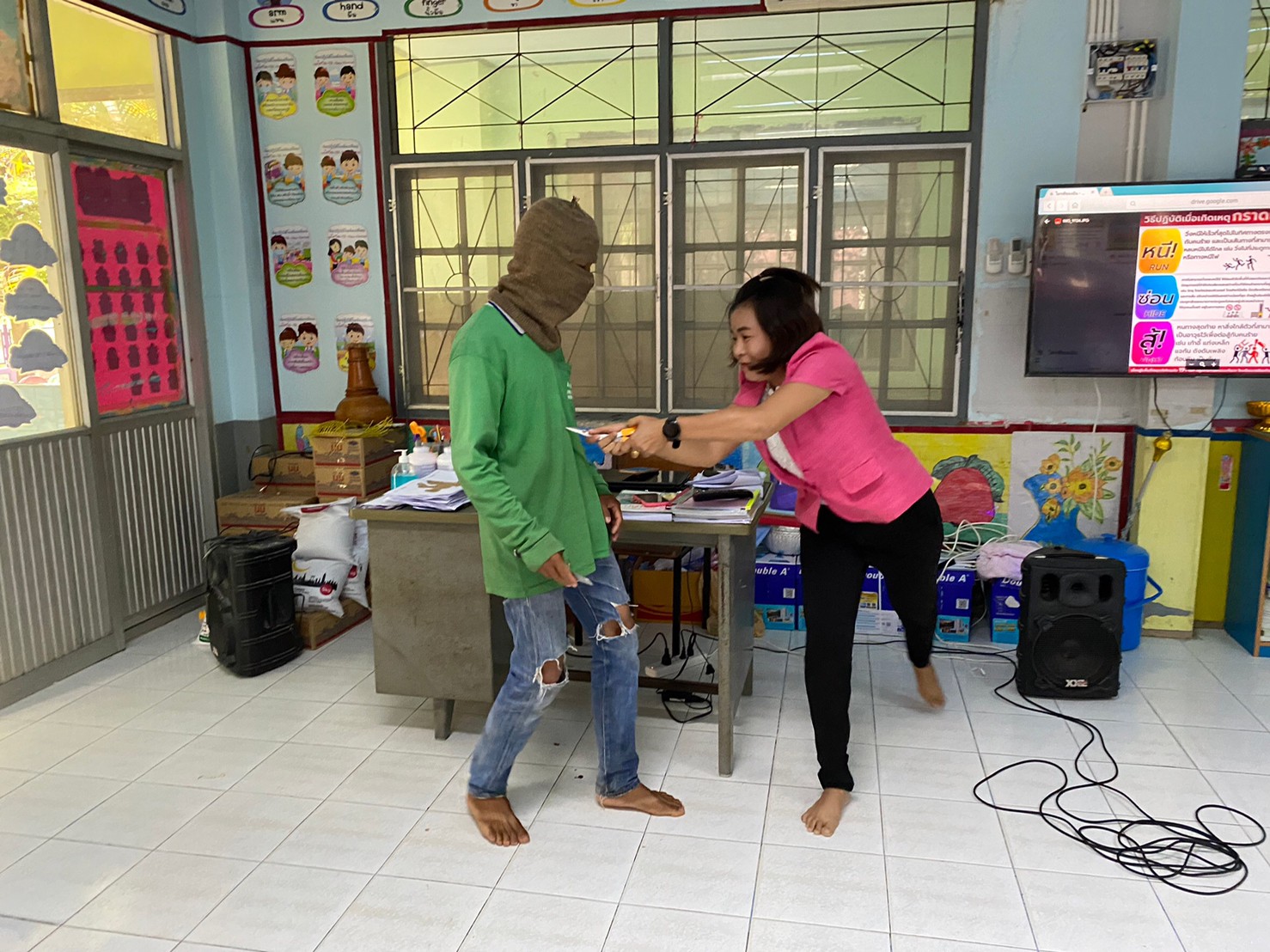 -สู้! (FIGHT) หนทางสุดท้าย หาสิ่งใกล้ตัวที่สามารถเป็นอาวุธไว้เพื่อต่อสู้กับคนร้าย เช่นเก้าอี้ แท่งเหล็ก แจกัน ถังดับเพลิง ก้อนหิน เป็นต้น ณ ศูนย์พัฒนาเด็กเล็กบ้านเหล่าอินทร์แปลง ตำบลช่องเม็ก อำเภอสิรินธร จังหวัดอุบลราชธานี